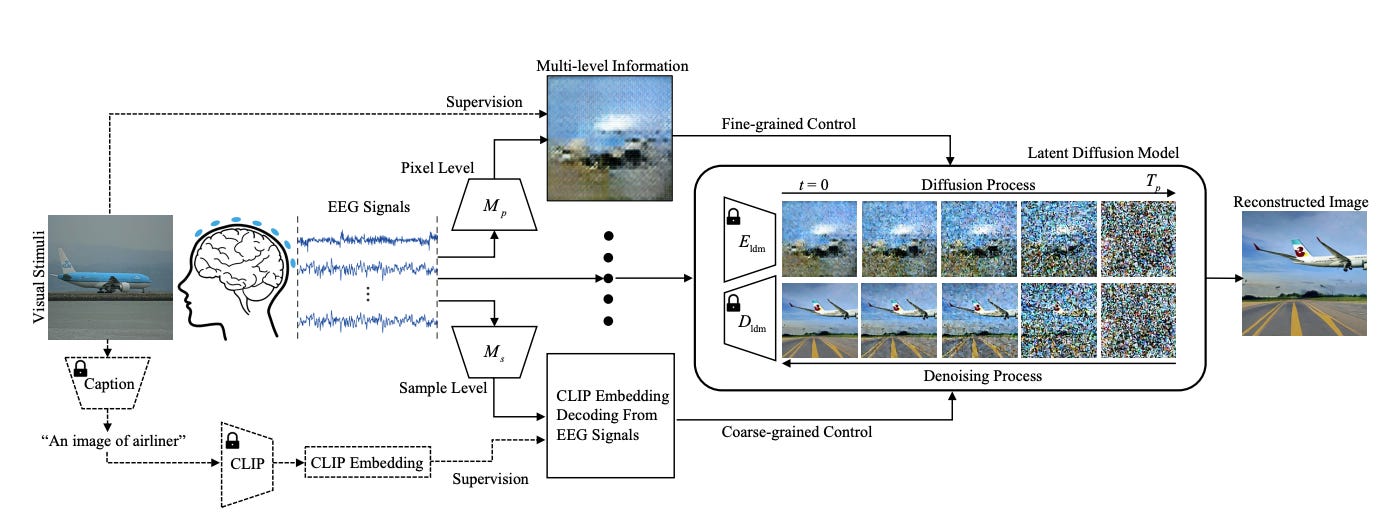 Lan et al. proposed NEUROIMAGEN, a comprehensive pipeline to reconstruct visual stimuli images from electroencephalography (EEG) signals. NEUROIMAGEN first extracts multi-level semantic information from the EEG data, including pixel-level saliency maps and sample-level text descriptions. The multi-level semantic representations are then fused using a diffusion model to generate high-resolution reconstructed images. Specifically, saliency maps are generated using contrastive learning to align EEG embeddings from similar visual stimuli. A GAN model then produces the maps from the EEG features. Meanwhile, sample-level text descriptions are derived by aligning EEG signals to generated captions describing potential image content. This captures coarse-grained semantic information about the main objects in the image content. Though less detailed, these textual features provide accurate high-level information to aid reconstruction. Both qualitative and quantitative experiments demonstrate NEUROIMAGEN's capability in accurately recounstructing images from EEG data.