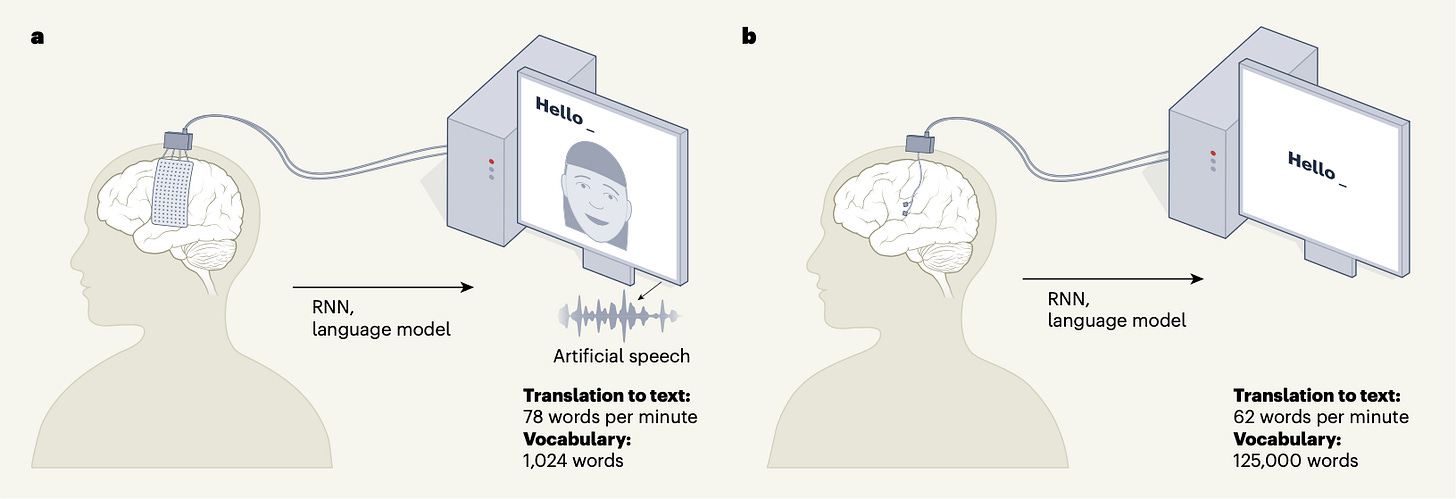 Metzger et al. and Willett et al. provided proof of concept of using implantable BCIs to restore communication in individuals who cannot speak intelligibly as a result of paralysis. Both studies record brain activity via implanted BCIs and then use recurrent neural networks to convert the brain activity to text, followed by using language models to compose sentences. Metzger and colleagues' BCI uses electrodes on a wide area of the brain's cortex to record brain activity. Willett and colleagues' device uses microelectrode arrays implanted into the cortex to record fewer neurons. It remains to be seen which BCI approach will best serve the needs of users in terms of safety and long-term efficacy in real-life applications.