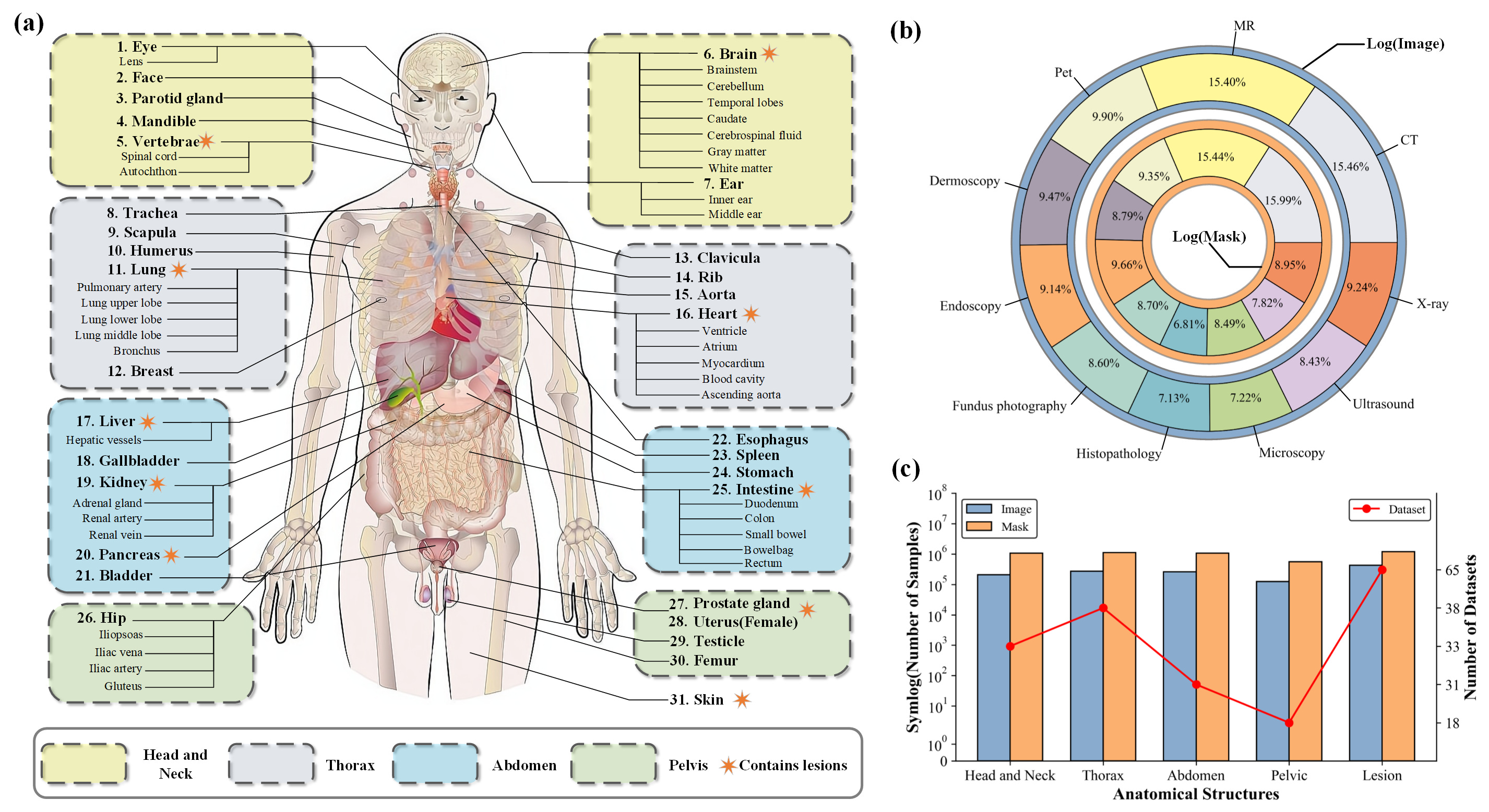 Cheng et al. developed SAM-Med2D for medical image segmentation by transferring SAM from natural images to the largest medical image segmentation dataset ever curated - with about 4.6M images and 19.7M masks from public and private datasets, including various imaging modalities (such as CT, MR, and X-ray), different organs, and multiple pathological conditions (such as tumors and inflammations). SAM-Med2D demonstrated (1) superior performance in handling complex organ structures, lesions, and cases with unclear boundaries, (2) a broad segmentation capability across bounding boxes, points, and masks, and (3) strong generalization ability, allowing direct application to unseen medical image data.