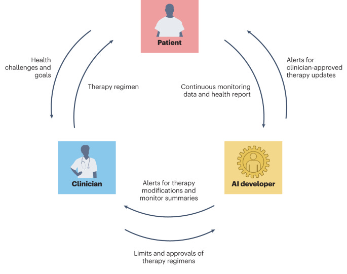 In this Perspective, Chen et al. propose ClinAIOps, a framework to operationalize AI in clinical settings by coordinating stakeholders through feedback loops. In the context of continuous therapeutic monitoring (CTM), ClinAIOps enables patients to make timely treatment adjustments using AI outputs, clinicians to oversee patient progress with AI assistance, and AI developers to receive continuous feedback from patients and clinicians for quality assurance and model improvement. By tightening the links between patient health, therapeutic regimens, and clinical interactions, applying ClinAIOps in CTM can replace the infrequent, inaccurate, and delayed reporting of symptoms and events, allowing patients to focus on understanding the determinants of their health, and clinicians to deliver and evaluate patient-specific and evidence-based interventions. This may be particularly beneficial for patients with limited ability to self-report symptoms, with limited mobility or access to medical centers, or who experience difficulties in adhering to complex therapeutic regimens.