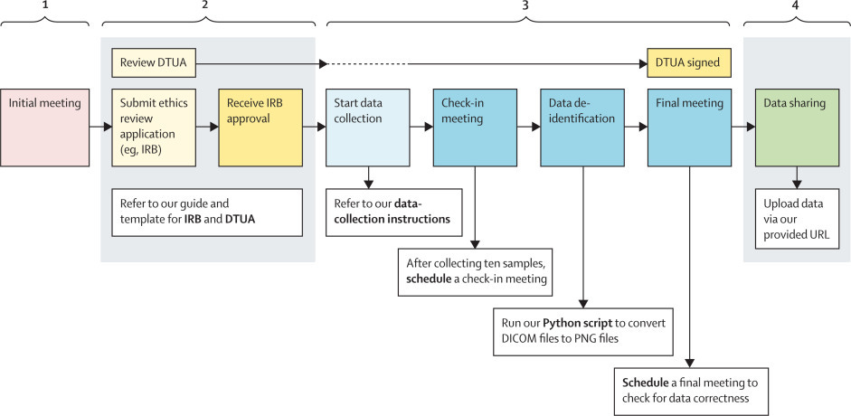 In this Comment, Saenz et al. introduce a framework for global medical imaging data sharing and share their experience in coordinating the Medical AI Data for All (MAIDA) initiative. MAIDA takes a grassroots approach, directly reaching out to and working with individuals at hospitals worldwide to collect representative chest X-ray datasets. The authors highlight the importance of providing templates to help these individuals obtain legal and ethics review approvals. They recommend allotting adequate time for approvals, as this is usually the most time-consuming step, often taking months. Because medical practices vary between institutions, the authors emphasize being flexible to accommodate differences rather than relying solely on standardized guidelines. Key recommendations include having comprehensive protocols and agreements ready, maintaining rigorous documentation for data quality and de-identification, but also adapting to individual institutional needs.