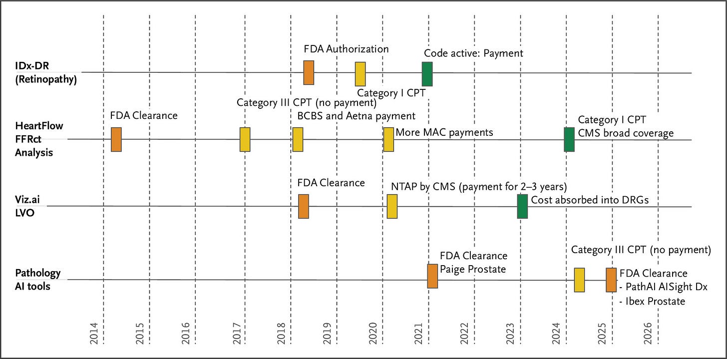 The Timeline and Major Reimbursement Events in a Few Health AI Domains with U.S. Food and Drug Administration–Approved Products. Source: Razavian et al., NEJM AI 2025.
